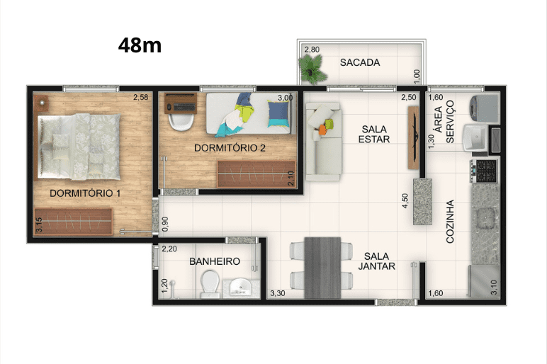 Planta 48m² Tamanho: 48m² Quartos: 2 Banheiros: 1