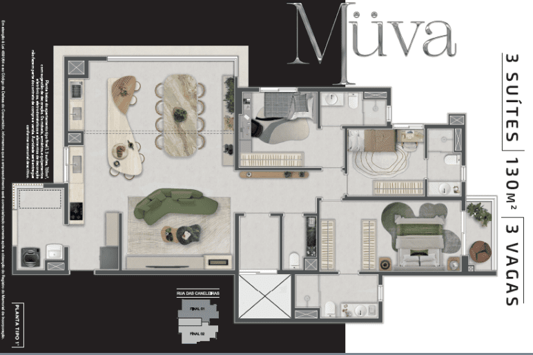 Planta 130m² Tamanho: 130m² Quartos: 3 Banheiros: 1