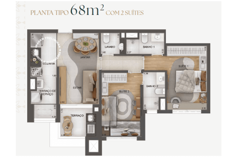 68 m Tamanho: 68M Quartos: 2 Banheiros: