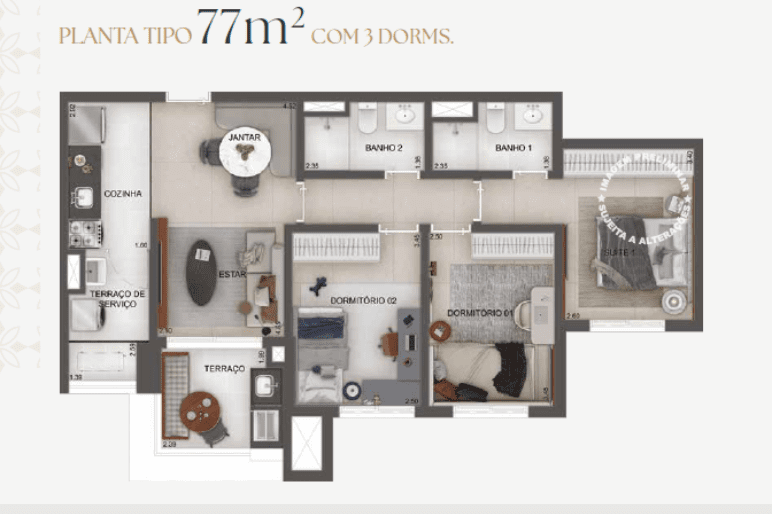 77M Tamanho: 77M Quartos: 3 Banheiros: